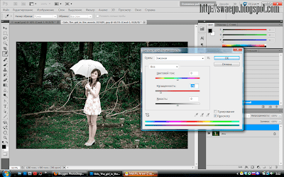 Берём инструмент Спанч Боб,просто Губка и обрабатываем наиболее яркие места на фото,не касаясь объекта,в данном случае симпатичной китаянки.