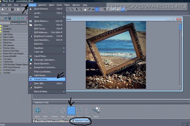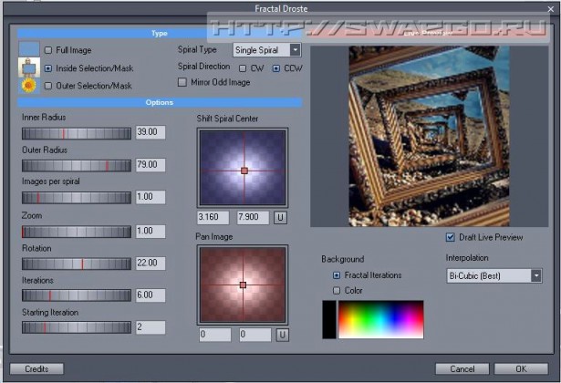 Теперь меню Adjust-Fractal Droste,появится окно эффекта,всё что дальше делать,является лишь методом проб и ошибок,какой-то конкретной настройки нет,поэтому крутите-вертите ползунки для достижения результата,который удовлетворит.